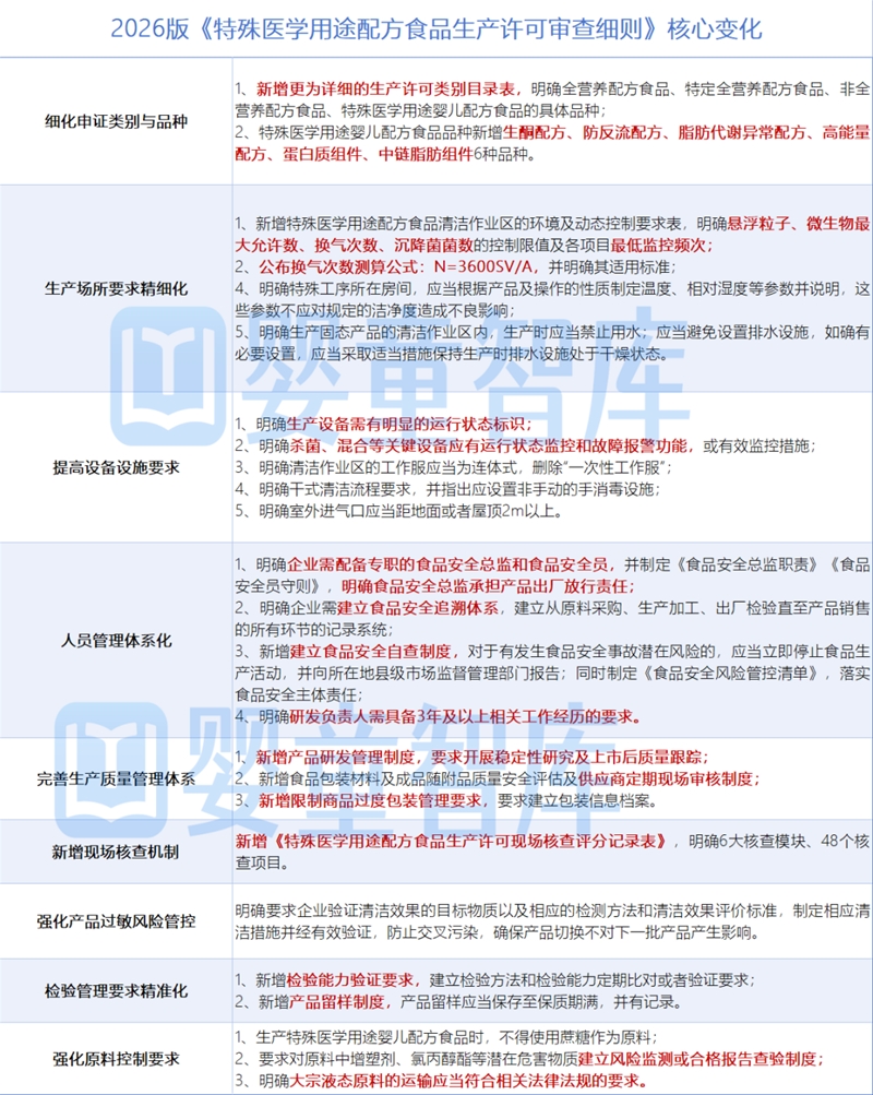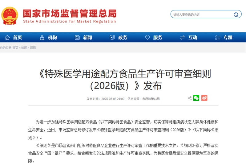 繼2019年市監總局發布《特殊醫學用途配方食品生產許可審查細則》后,2026年3月3日,全新修訂的《特殊醫學用途配方食品生產許可審查細則(2026版)》重磅發布!這標志著我國特醫食品行業監管進一步收緊,行業正式邁入最嚴監管新時代!