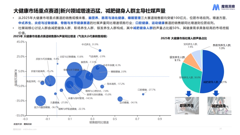 2025年,大健康市場持續增長,銷售額達到3043.8億,同比增長15.8%,銷量約29.2億件,同比去年增長19.0%。其中,保健食品類規模最大,2025年銷售額達到1244.8億元,占據大健康市場40.9%,同比增長19.9%。社媒端,養生相關話題討論量同比上升顯著,減肥健康人群占據話題討論的50%以上,反映出目前大眾對于健康的重視。