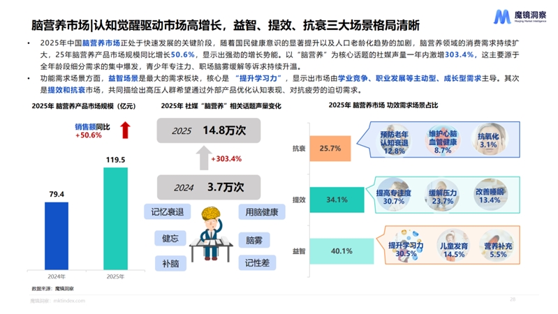 2025年中國腦營養市場規模快速發展,核心消費人群覆蓋嬰幼兒、青少年、職場白領及中老年群體,需求從泛化“補腦”轉向精準化訴求——青少年側重專注力與智力發育,職場人聚焦緩解腦霧、抗疲勞,中老年群體主打認知功能維護與神經衰退預防,日常保養與代際禮贈成為核心驅動場景。這一變化推動產業從傳統單一成分向“核心成分復配+靶向技術賦能+劑型創新”轉型,DHA、磷脂酰絲氨酸(PS)、神經酸等核心成分占比超55%,功能性軟糖、即飲制劑等適口性產品年增速達28.7%。
