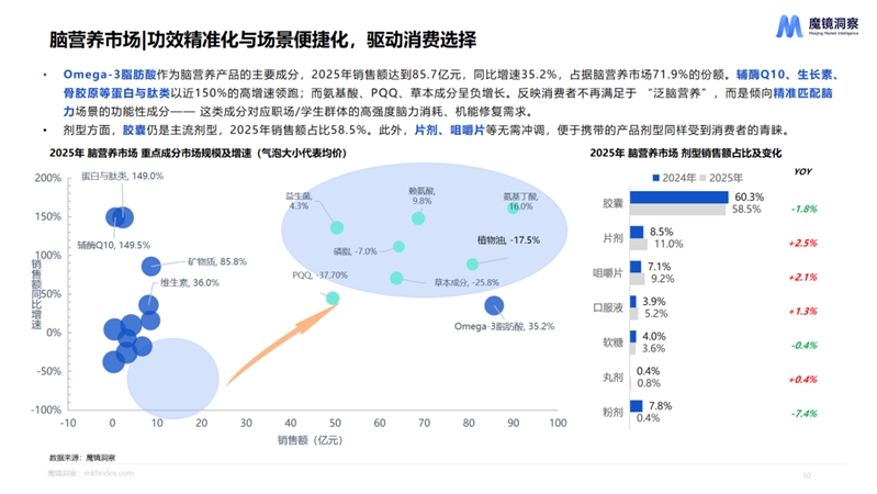 腦營養需求全人群滲透 + 場景精細化,魚油、Omega-3成分穩定市場大盤,膠囊型產品更受消費者青睞