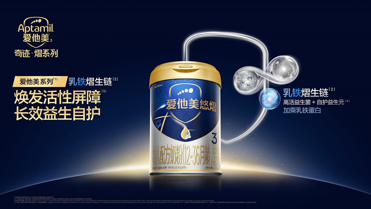愛他美悠熠3含愛他美首款“乳鐵熠生鏈”,以高達240億CFU7的高活益生菌,結合高量自護益生元,為雙歧桿菌提供營養,強強聯合,組成“熠生鏈”;并加乘2.2倍于臨床有效含量的乳鐵蛋白,從而幫助激發更多有益菌,幫助提升有益菌多樣性,幫助激發更長效“自護力”。