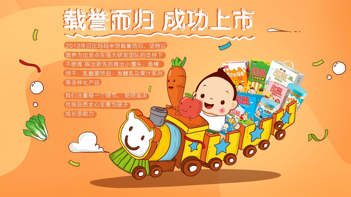 2013年貝比瑪瑪米餅載譽而歸,進駐中國各大連鎖店。堅持以營養為出發點,在強大研發團隊的支持下,不斷推陳出新,先后推出小饅頭、魚棒、餅干、乳酸菌飲品、發酵乳及果汁系列等多樣化產品。