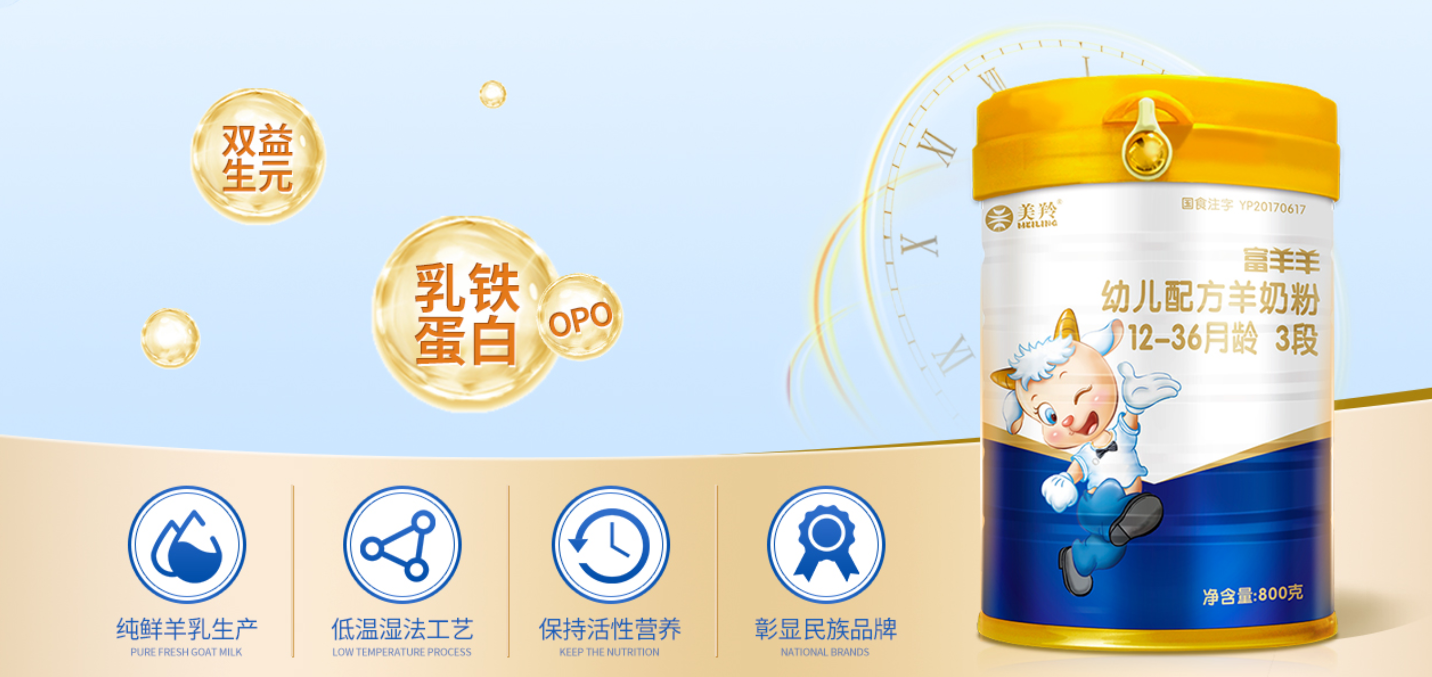 - 品牌特色:富羊羊嬰幼兒配方羊奶粉,堅守“純鮮羊乳生產、低溫濕法工藝、保留活性營養”的美羚品質,更好、更多地保留住羊奶中含有的乳鐵蛋白等活性營養因子,在配方中,富羊羊還特別添加了乳鐵蛋白、OPO結構脂、雙益生元組合FOS+GOS、CPP等成分。