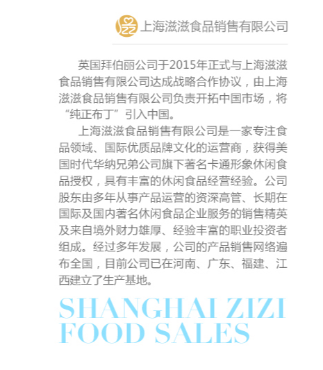 “上海滋滋食品銷售有限公司”成立于2006年,公司由多年從事食品研發、生產運營的高管、長期在國內外休閑食品企業服務的銷售精英、以及財力雄厚、經驗豐富的職業投資者組成,是一家集食品研發、生產、銷售于一體的綜合型食品企業;歷經10余年穩健發展,公司已形成遍布全國的銷售網絡,擁有很高的市場占有率,產品涵蓋巧克力制品、糖果、餅干、海苔、山楂、布丁等休閑食品、高濃度果漿、果蔬漿飲品。旗下擁有“童麟”“布町女王“”黑帽子“等品牌,受到消費者關注與喜愛。