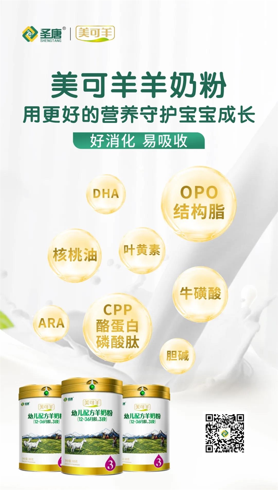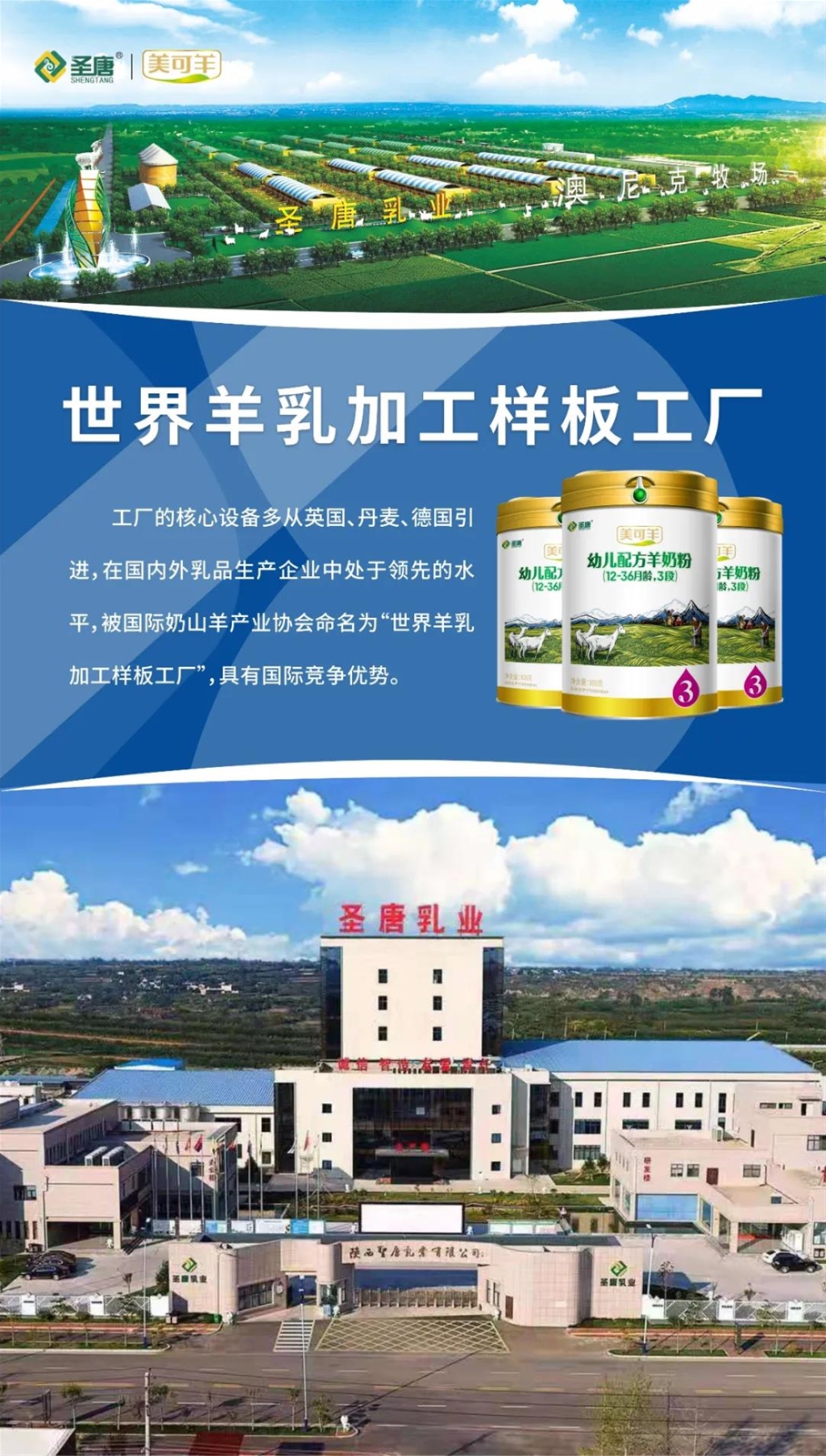 - 品牌特色:圣唐•美可羊羊奶粉誕生于全透明智能化工廠。質量、安全、品質皆有保證,營養好吸收,適合中國寶寶體質。 為了保證奶粉先天的新鮮品質,圣唐羊奶粉的生產從鮮奶運輸到制造,將整個過程打造2小時“生態圈”。
