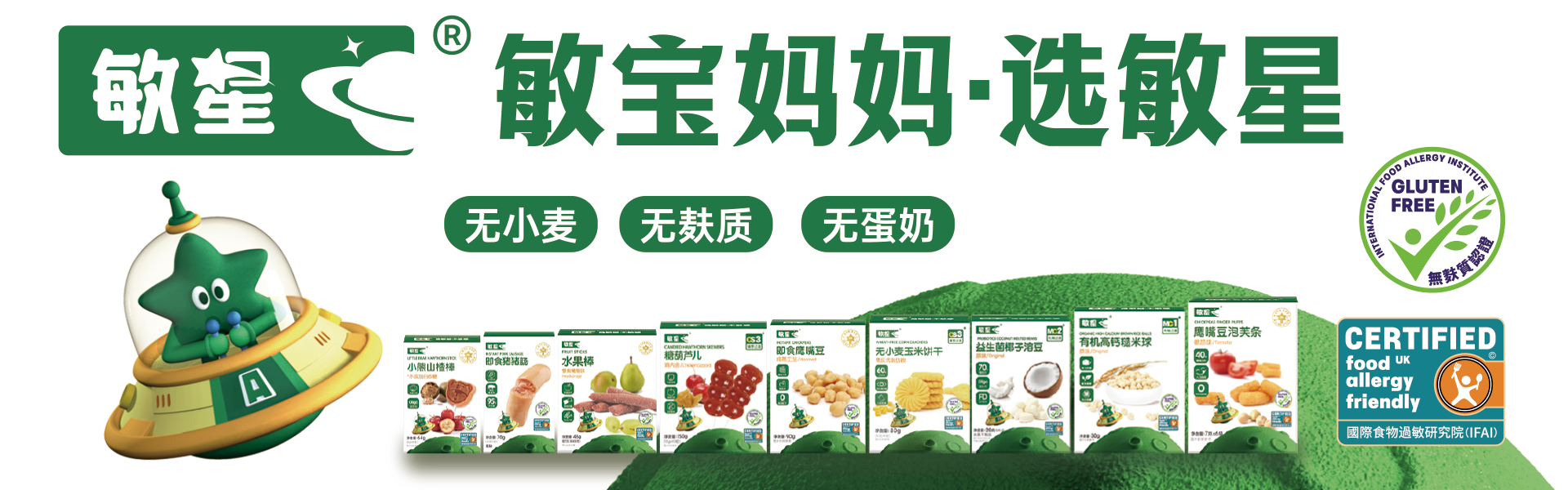 敏星全系列產品均不含八大常見食品過敏原,這大大降低了敏寶發生過敏反應的風險。然而,鑒于每位敏寶的體質差異以及過敏源的多樣性,敏星無法確保對所有敏寶均無過敏,但我們始終致力于為敏感體質的寶寶提供更安全、更健康的選擇。