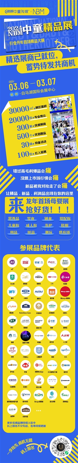 作為中國(guó)母嬰行業(yè)首家精品展,NBM中童精品展再次全面升級(jí),包括營(yíng)養(yǎng)健康展、潮流風(fēng)尚展和奶粉食品展三大子展,涵蓋營(yíng)養(yǎng)品、零食、輔食、嬰配粉、兒童粉、成人粉、洗護(hù)、鞋服、用品、紙品、潮玩、供應(yīng)鏈等12大品類,更精準(zhǔn)、更高效、更專業(yè)、更潮流的NBM中童精品展,不僅可以滿足全渠道買家的一站式選品需求,更能夠幫助品牌實(shí)現(xiàn)生意大增長(zhǎng)。