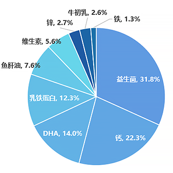 從2020上半年最新細分品類銷售額占比來看,益生菌、鈣、DHA、乳鐵蛋白4大單品占據了整個母嬰營養食品類80%的銷售額,體現市場消費者對4大單品的巨大需求。