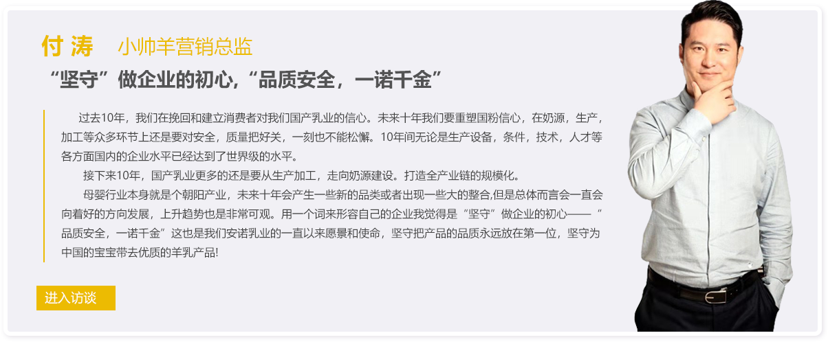 我從事母嬰行業已經5年了,目前有50余家門店。小帥羊進駐我們宏勝商貿公司以來,以年輕、親和的“黃金陣營“迅速得到各門店的歡迎。如今羊奶粉特別受新一代家庭的信賴,小帥羊根據總部的活動推廣,客戶有媽媽班,導購有紅包激勵,店老板有訂貨政策,我們統統發動門店執行落地。相信在未來發展的道路上,我們宏勝能與小帥羊相互成就,合作共贏。